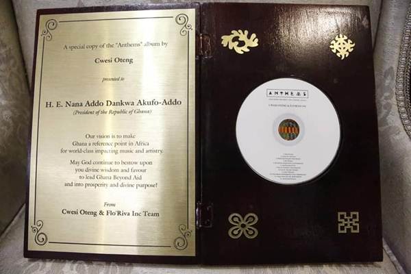 Award-winning gospel recording artiste and songwriter, Cwesi Oteng, on Wednesday, 13thFebruary, 2019, paid a courtesy call on the President, His Excellency Nana Addo Dankwa Akufo-Addo, at the Jubilee House to present a special copy of his recently released ‘Anthems’ album to the President.