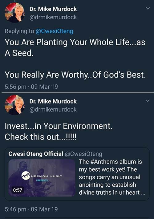 The legendary Christian author quote-tweeted Cwesi Oteng’s ‘Anthems’ album ad and recommended the album to his followers by writing ‘’…invest in your environment. Check this out!’’. Dr. Mike Murdock also added an encouraging word for Cwesi, ‘’You are planting your whole life as a seed. You really are worthy of God’s best.’’